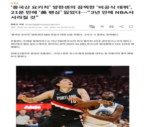 大家都担心他到底能不能够在NBA发展,他能不能够像当初的前辈姚明一样,在篮球的最高殿堂闯出一片天。随着这场比赛结束后,目前韩国媒体也是看热闹不嫌事大,在他们的社交平台刊登了一篇文章,点评了本次杨瀚森NBA季前赛的首秀。还引用了国外网友的一句话,认为这位中国的约基奇在三年内必定会在NBA消失。