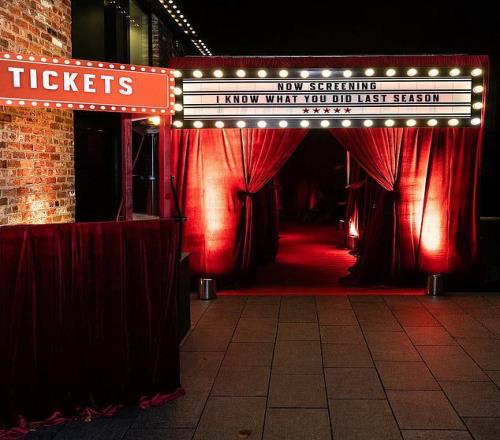 客人们在一个电影院风格的入口受到迎接,红色的帷幕和一个发光的标志宣布着当晚的主题。
